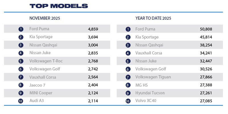 The Ford Puma was again the UK’s best-selling car in November, outselling the Kia Sportage – its main rival in the 2025 sales race – by about 1,000 units. That gives the Puma a formidable lead with just one month to go, although we have seen large swings in the last couple of months in recent years so Ford won’t be celebrating just yet (and Kia has an updated Sportage now in showrooms).