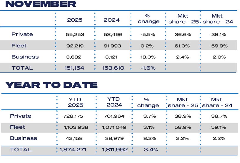 New car registrations were down by about 2% in November, with private sales down 5.5% and fleet registrations flat compared to the same month last year.