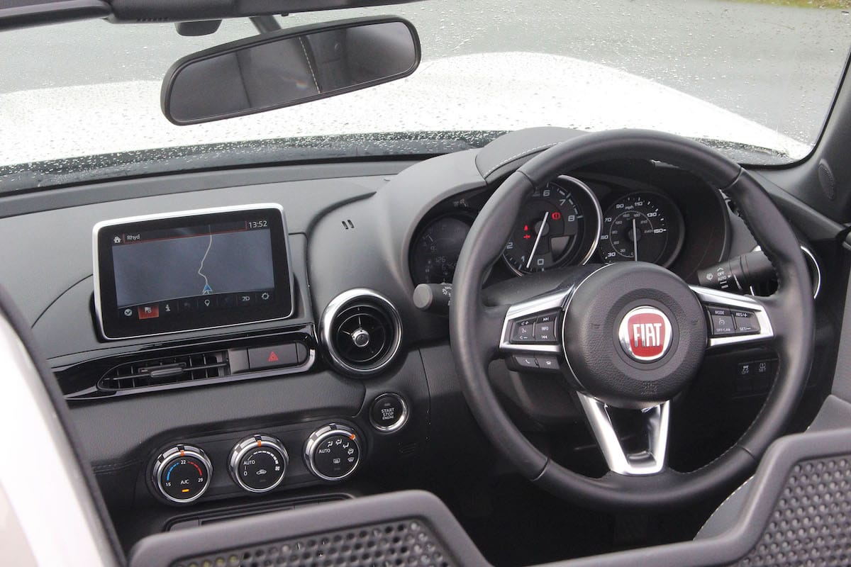 Talking about the interiors of the two cars is much easier as they are effectively the same, originally created by Mazda’s designers. The exterior metal, and its colour, extends along the door tops of the Mazda while the Fiat goes for an interior panel.