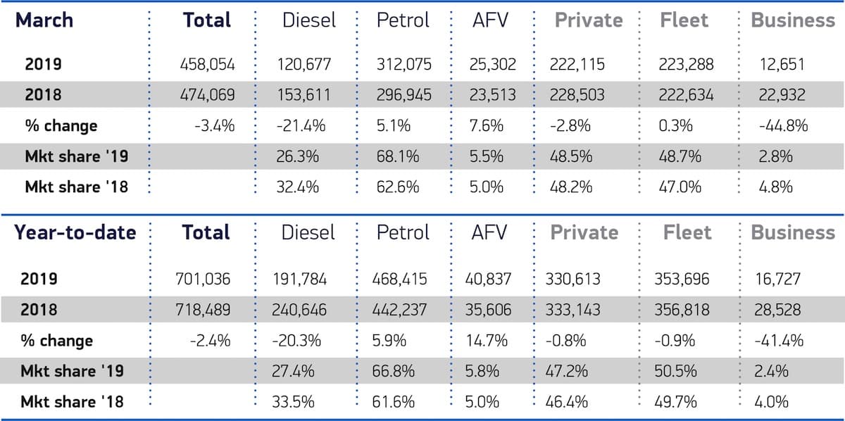 While it’s no surprise to see diesel sales continuing to slide, the stagnation in alternatively-fuelled vehicles (electric and hybrid cars, basically) remains a concern. While there was growth of more than 7% on the same month last year, an overall market share of 5.5% is well below the average figure for 2018, and has slid backwards from the last two months.
