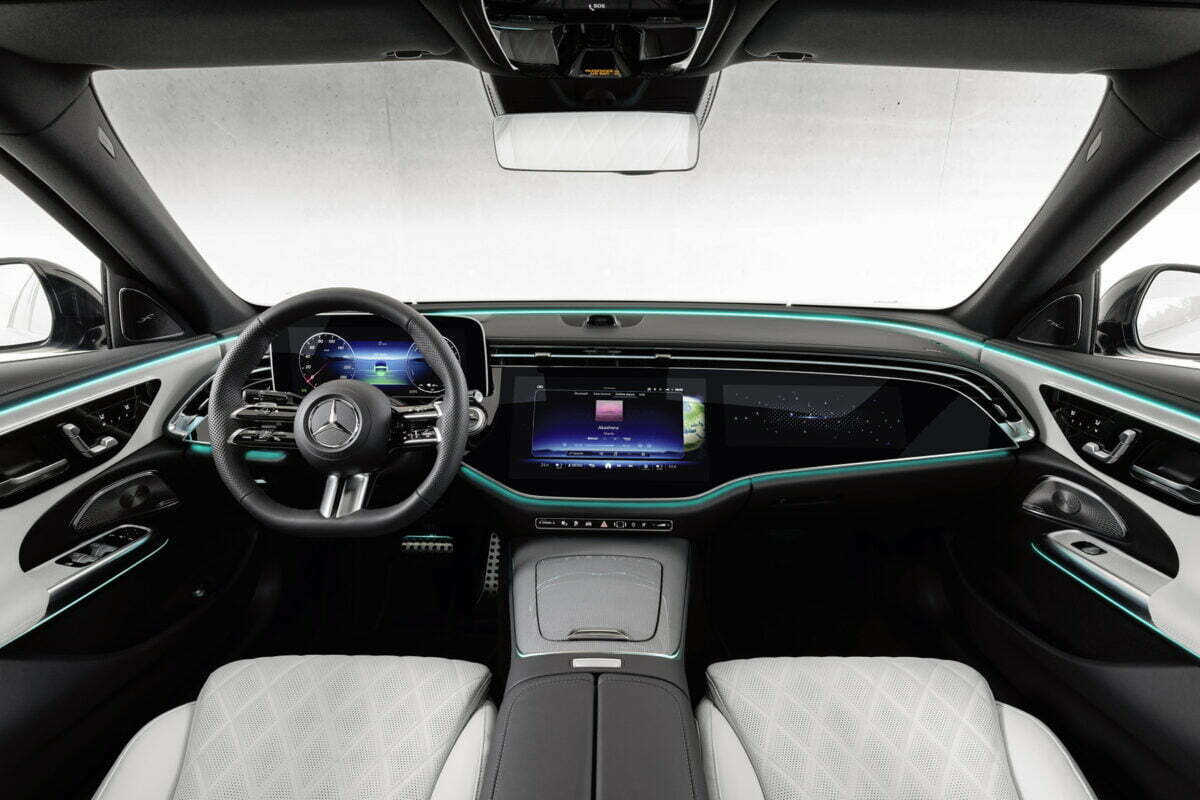 Inside, the most notable addition is actually an optional extra – the E-Class ‘Superscreen’ dashboard. This is essentially a smaller version of the ‘Hyperscreen’ currently available in the more expensive S-Class and electric EQS model lines, combining a digital instrument cluster, a central infotainment console and a passenger side multimedia display into one continuous screen.